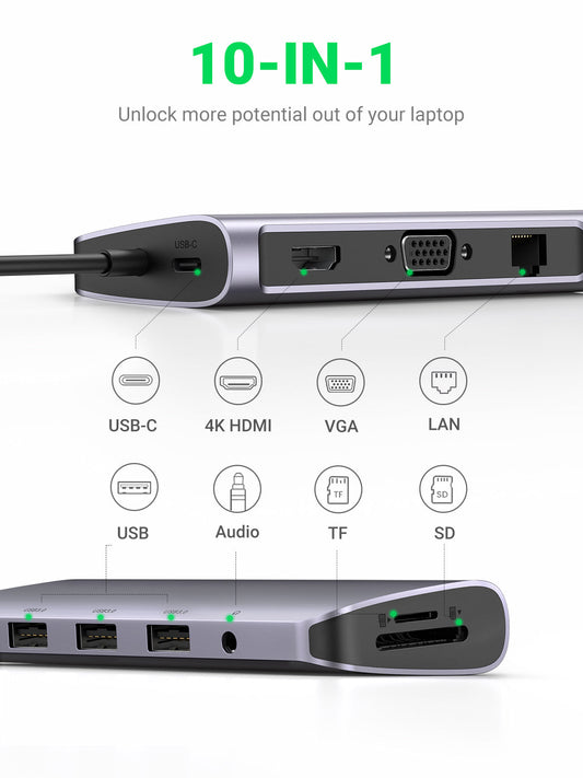 10-in-1 USB-C To 3*USB 3.0 A+HDMI+VGA+RJ45 Gigabit+SD/TF+AUX3.5mm+PD Converter Ugreen